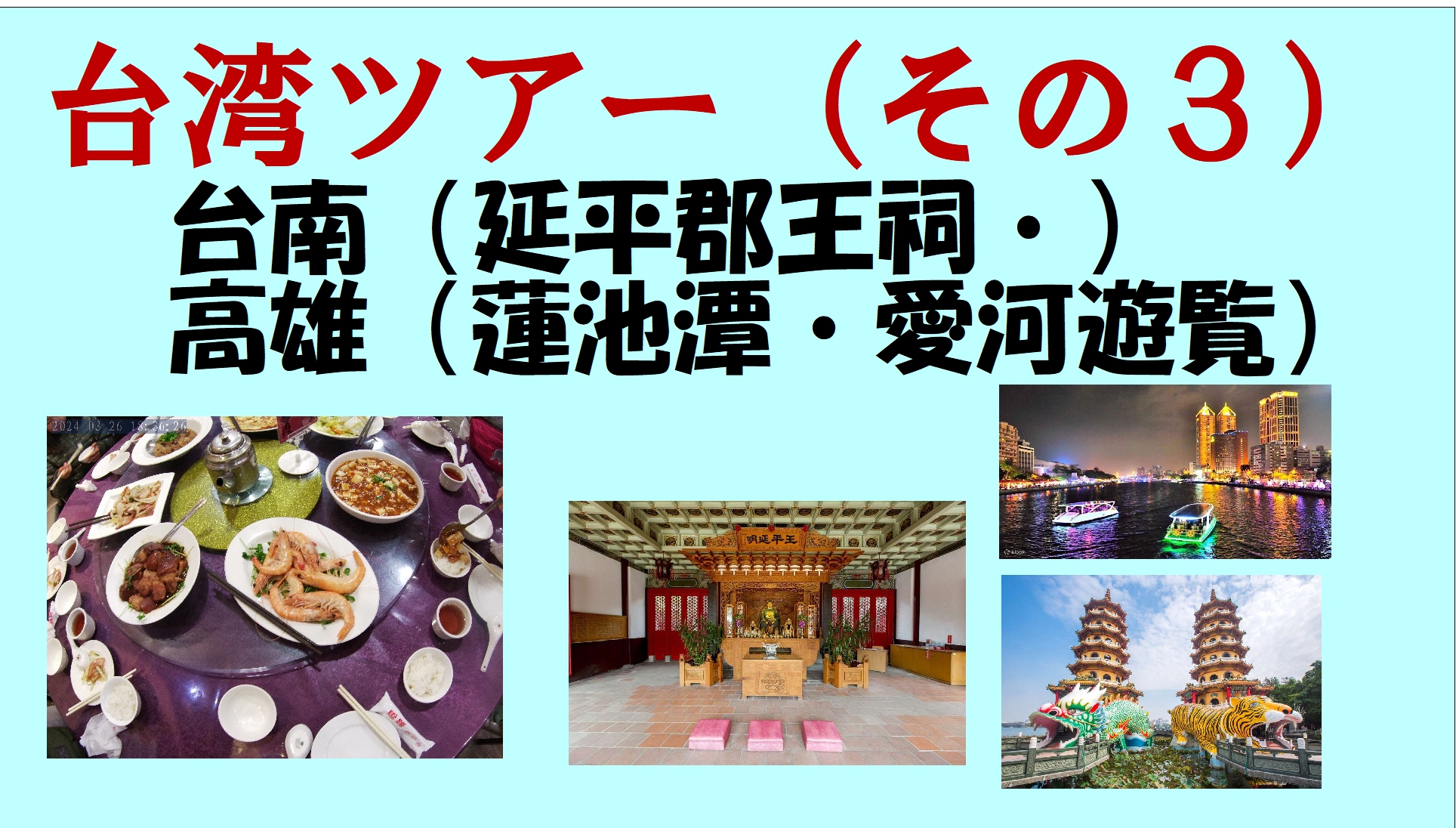 ttps://youtu.be/_6xOtM5ASy41.台南「神農町」を歩く 2.台南「延平郡王祠」 3.高雄市 蓮池潭(れんちたん)、龍虎塔、慈済宮 4.高雄市 愛河遊覧