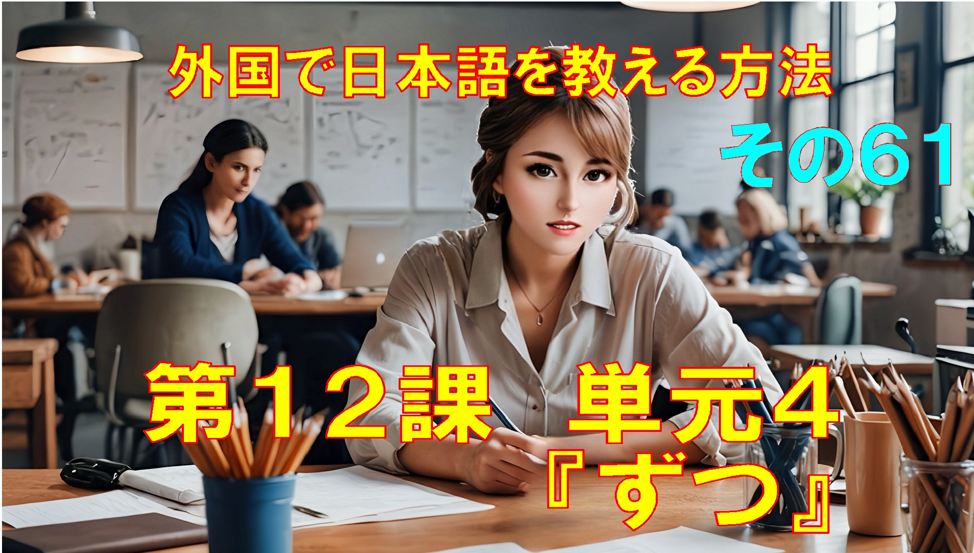 佐藤:はい、そうです。ここに えんぴつと こっぷが あります。ここに えんぴつが 5本あります。ここに こっぷが 5こ あります。ここに 長い物と かたまりが あります。えんぴつと こっぷは 物です。物は 「つ」と 数えます。ここに えんぴつと こっぷが 五つずつ あります。