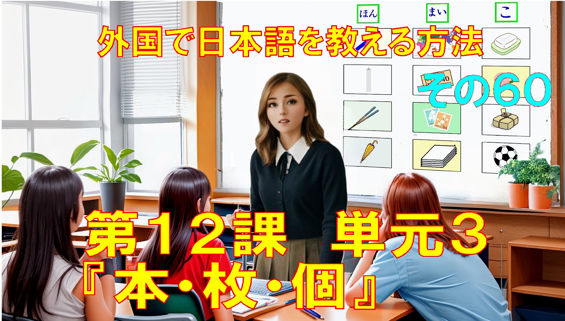 佐藤:はい、そうです。 長い物は 「本」と 数えます。ここに 長い物が いっぽん、にほん、さんぼん、よんほん、ごほん、ぜんぶで 5本 あります。ここに 長い物が ぜんぶで 5本 あります。では、しつもん。 ここに 長い物が ぜんぶで なん本 ありますか?みんな いっしょに 数えなさい。