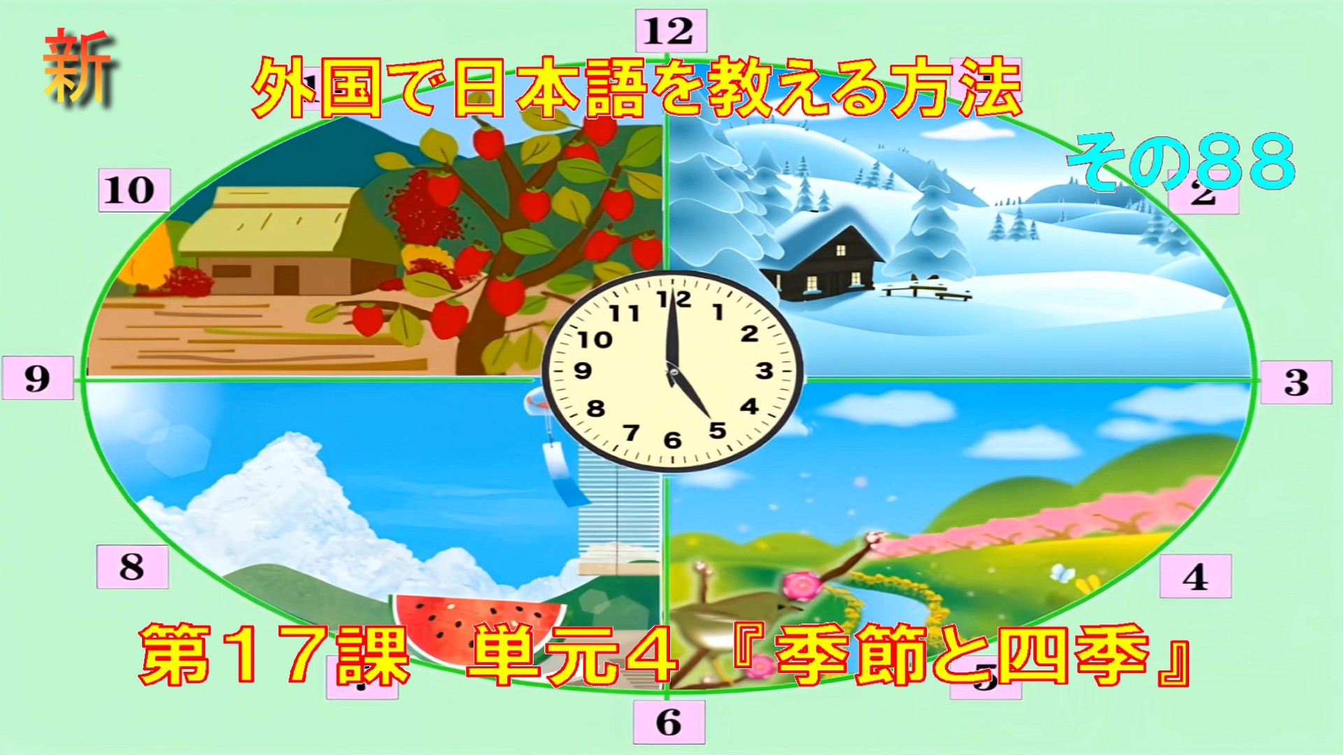 では、質問。日本には 季節が なん季 ありますか?せいぶん 答え、みんな いっしょに どうぞ。